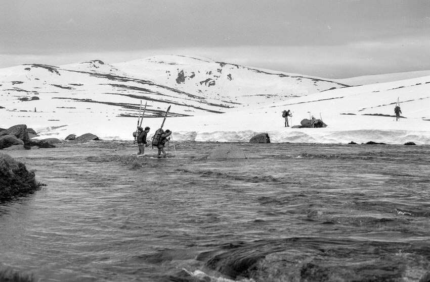 The Snowy River crossing was very interesting as usual. Peter, Chris and Steve Brown brought their wet-suit booties of the crossing. Peter shuttled those three pairs back and forth for our comfort a total of seven crossings. We headed up between the creeks towards a campsite under Mount Clark, this trip requiring a lot of walking with a patchy snow cover.