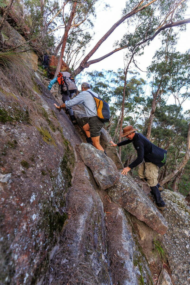 Our descend from Mount Strongleg along Strongleg Ridge was detailed in Dave’s guidebook as quite treacherous and taking four hours. So after selecting walking sticks from the bush to assist with the descent we proceeded and were pleasantly surprised to arrive at camp in only 70 minutes, well inside the guidebook’s time. We celebrated with a relaxed afternoon at the pleasant grassy campsite next to Kanangra Creek. Sue managed to start the campfire yet again with just one match.
