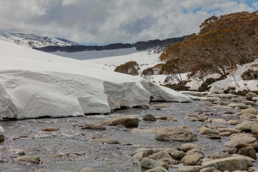 Along Spencers Creek the cold wind returned and had definitely not lost any speed as was forecast. We propped ourselves up against a snowgum on the grass for a sandwich before quickly getting the skis back on and continuing as we were getting very chilled.