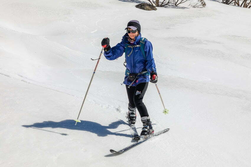 Tuesday’s forecast temperature was 8C with winds to 70km/h after an overnight low of -4C. Finding somewhere out of the wind seemed the best idea. After waiting a while for the snow to soften after it’s overnight freeze we headed straight up the hill behind the lodge hoping the trees would provide a little shelter. We were still too early for our planned return descent, as there were still plenty of frozen sections in the shade around the trees, so after ascending most of the hill we headed further around towards Wrights Creek in order to find a slope that had seen more morning sun.