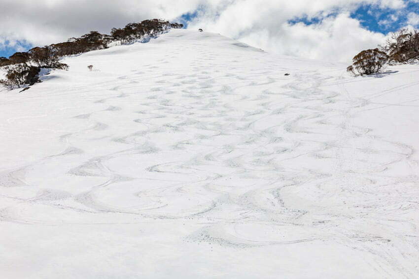 With a week trip based on Mount Twynam planned for the end of the week I opted out and instead completed two 350m vertical runs down along Mount Twynam’s northern spur to the east of Watsons Creek. Although not as steep as runs off Watsons Crags, this spur can easily be followed down to the unnamed creek on its eastern side where water is often easily accessible. The run has good width its entire length and was free of obstacles such as exposed rocks and trees. It also provides sensational views, especially towards Watsons Crags and any skiers or boarders who may be there testing their skills on it’s steep descents. To my mind, the spur I was skiing was plenty steep enough, to ascend! With this under consideration I try to get as many telemark turns in as I can on each descent, which makes it almost as demanding as the climb.