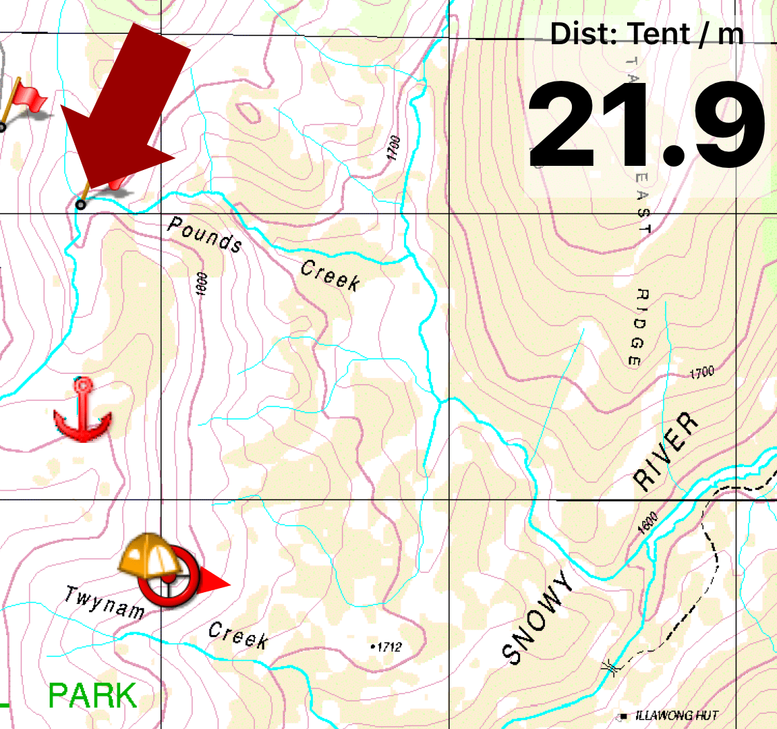 Where would you go? After I emailed this screenshot of our campsite location to Ian, confusion reigned. His responses didn’t make sense to me and my descriptions failed. Would you aim for the tent icon or where the arrow points?