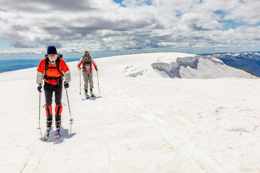 Our take off point was straight off the steep eastern side of Northcote Pass alongside the cornice. Stephen and I managed to leave a competent trail of turns down the descent. Mike was a lot more cautious on his lighter skis with failing bindings and traversed the steeper sections.