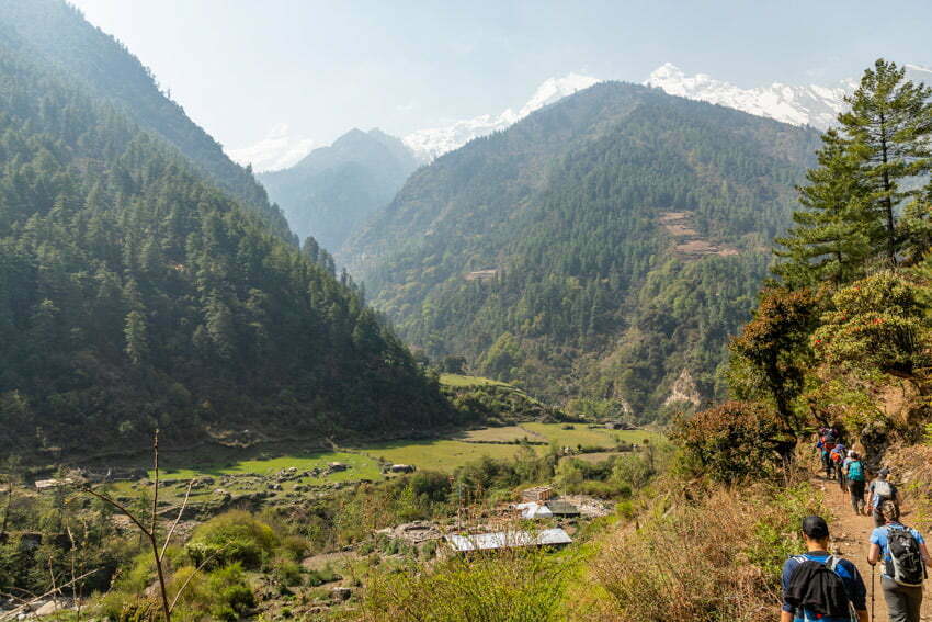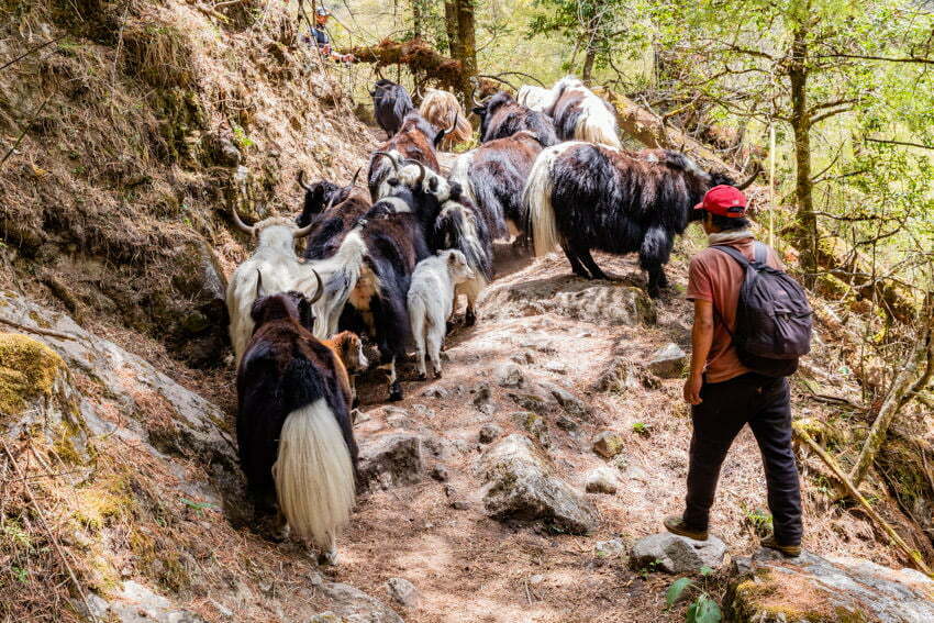 Day 17 on the Manaslu Circuit, a rhododendron forest, donkey train delivery and all our party.