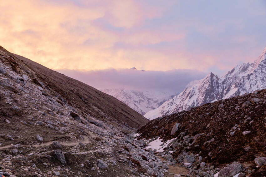 We awoke at 3:00am to prepare for a 4:00am departure. It was cold, dark and fairly clear when we headed off. We were just putting one foot in front of the other as we walked along the barren and frosty trail. We climbed along the northern moraine of the Larke Glacier. I wore five layers on my top half including a down jacket and three layers on the bottom and I was quite comfortable. After about an hour there was enough light to be able to see the emerging scenery. Dawn light revealed the pink tinged stunning mountains that surrounded us.