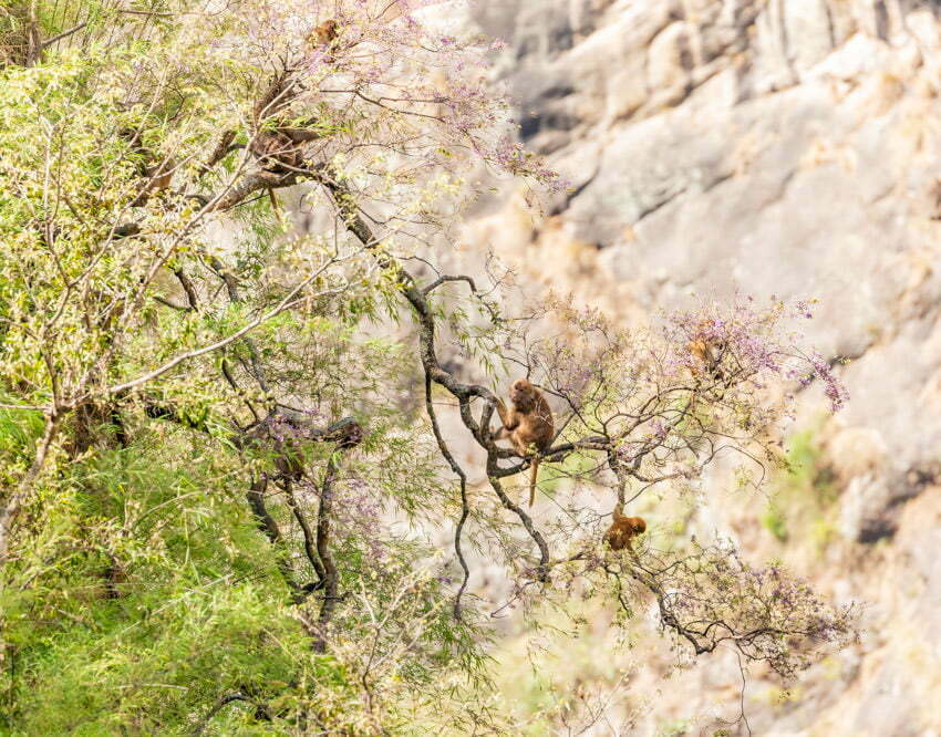 The trail climbed gradually through forests, past terraced ridges and several waterfalls. There were locals carrying loads and donkey trains. There were monkeys swinging between branches of the trees beside the trail.