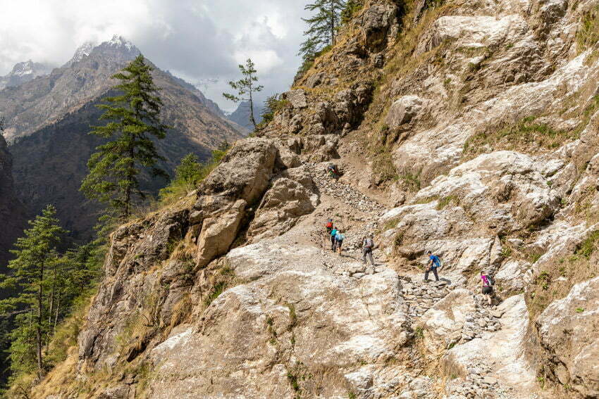 After about three hours walking we reached an avalanche slope which had injured a walker with a rockfall the previous day. We were advised to approach the area with caution. Two of our porters had already passed the section with their loads by the time we got there. They and our guides were constantly on the lookout for rockfalls and called out instructions to us as we crossed. There were close calls for Emily and Wendy with rocks falling about two metres away from both of them. The guides and porters did a fabulous job of getting us across safely. It certainly got the blood pumping!