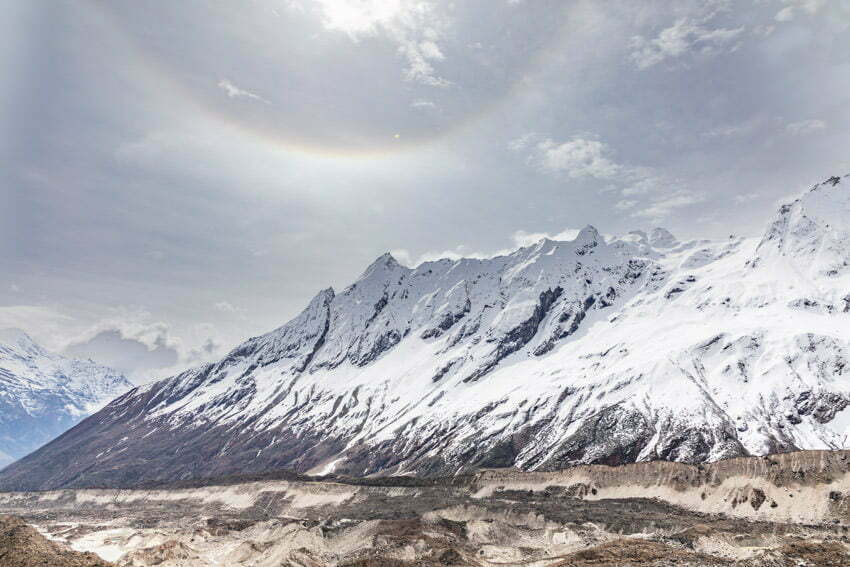 Every turn revealed even better views and we gradually ascended the valley towards the Larkya Glacier. We arrived at the temporary settlement of Dharamsala (4,460m) in time for lunch. Our accommodation this time was in tents and very simple. The toilet was apparently in a dreadful state but there were a few long drop toilets which offered the best option. It was quite ironic that in the “dining room” which had a floor of rocks and dirt there were plastic flowers in vases on the table.