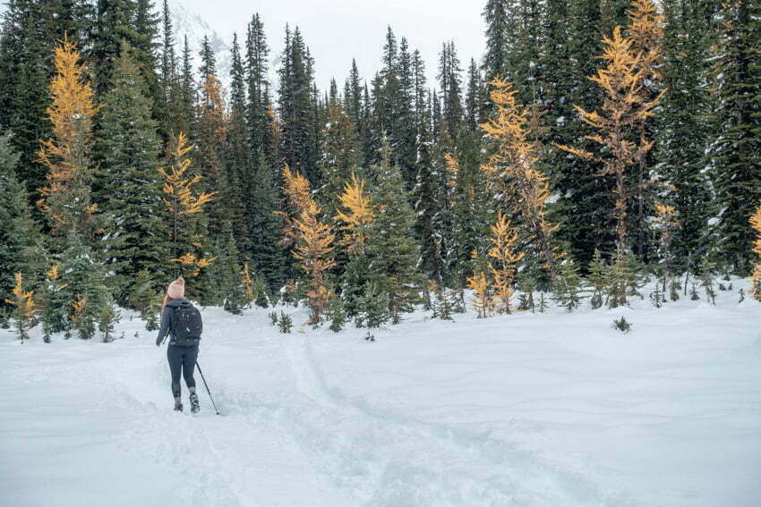 We started out on the snow covered trail with light snow flurries falling. The maintained track was hard packed but a little slippery in places. Snow hung heavily from the branches of the pine trees which contrasted with the fall orange foliage of the larch trees. It was perfect weather for walking as we made our way up the forested trail. A ground dwelling bird greeted us and luckily we saw none of the bears who frequent this area. We had our bear spray handy just in case!