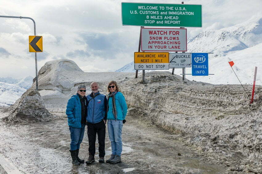 We continued heading towards the US border and White Pass, noting the absence of a wall at this border! As we had not applied for a US visa we pulled up and turned around before the custom check point, although we had entered US territory. The melt was starting here with lots of brown snow visible. The mountains appeared to go on forever.