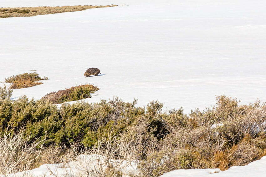 Departing the summit at 3:00pm I had a great descent back down, with just a hint of crusting as the snow was cooling off. After crossing another snow bridge upstream from the morning’s route, I was very fortunate to encounter an echidna just past the Snowy River. From here I made my way to the top of the Kangaroo Ridge Triple Chairlift through the snow gums. By the time I made this final descent half the slope was in shade and was very lumpy and frozen. Back to the lodge at 4:30pm.