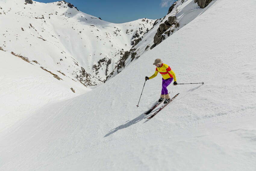 Opting for company today I joined up with Kenn’s group who were aiming for Little Austria. With snow bridges still strongly present we were quickly across the Snowy River and climbing towards the pass between Mount Lee and Carruthers Peak. The short steep ascent up and over the lip of the ridge proved challenging to those with lighter boots and skis.