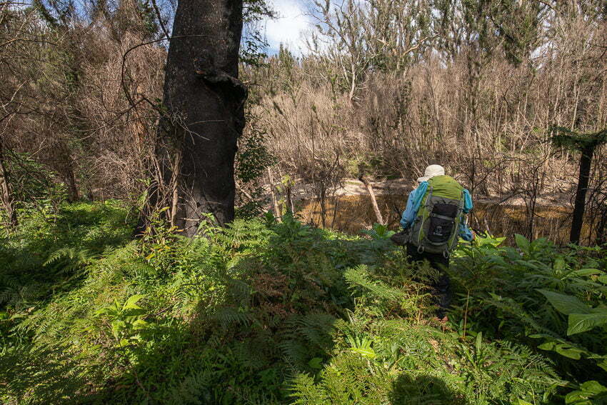 It wasn’t very long into our day before it became obvious the post-fire regrowth at ground level was doing really well. Away from the sandy, stony river bed and banks the soil was covered in a thick carpet of lush green regrowth of grasses and weed-like plants up to and over head height in several stands. The ground itself and whatever hazards there might have been there were not visible at all. We were lucky to spot a number of deep stump holes but not some of the numerous trip hazards as we negotiated our path around fallen, blackened trees.