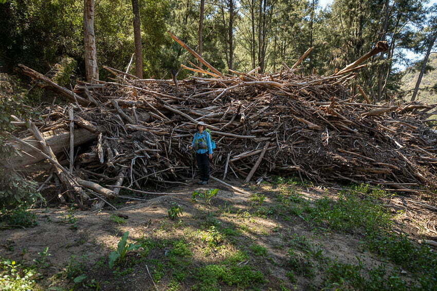 For about a kilometre past Bungonia Creek the hills rise steeply from close to the river leaving a narrow bank. About a month ago there was a major rainfall event of around 300mm in the area and consequent flooding. The force of the floodwaters had flattened many hundreds of trees, leaving an obstacle course behind. With careful observation and a couple of short backtracks we worked our way through this maze. At the end point of flattened tree section was a particularly impressive wall of broken timber about 3m high and 15m long. Past this point, where the river is wider, there was much less flood debris and easier walking.