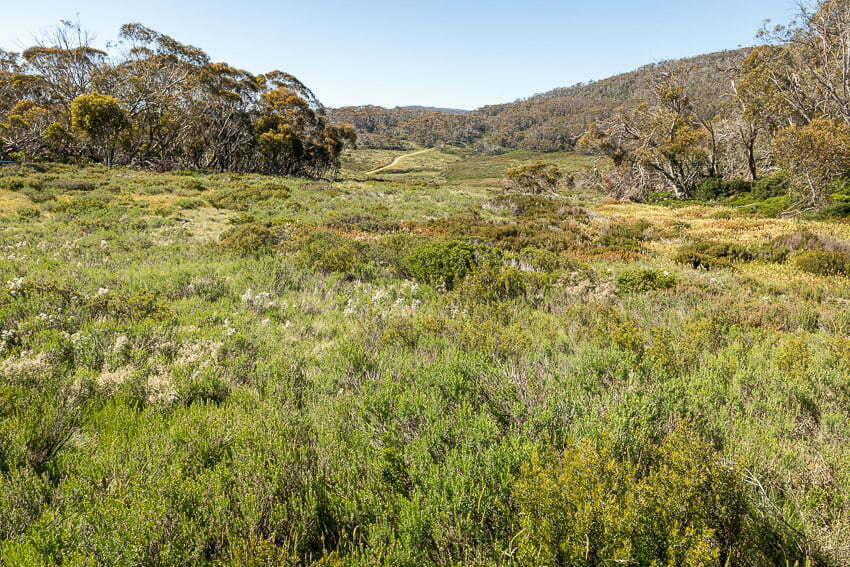 Today two tents were pitched nearby. I was able to chat with one solo hiker and offer some suggestions on how she might be able to fill her limited remaining time. From here we headed up the short steep hill behind the hut onto the Snowy Hydro track in order to investigate it as an alternative option for winter. This appears to be an active 4WD track for servicing Snowy Hydro infrastructure. Here we found the snow gums to be taller than near the main road and the undergrowth thicker. We also crossed several short steep dips along of about 10m on this route. Again, like the earlier Munyang River crossing option, I decided the road in is an easier option for carrying a heavy winter pack on skis. I would like to check out this route in the other direction up towards White River in winter but would most likely try this first without carrying a pack!