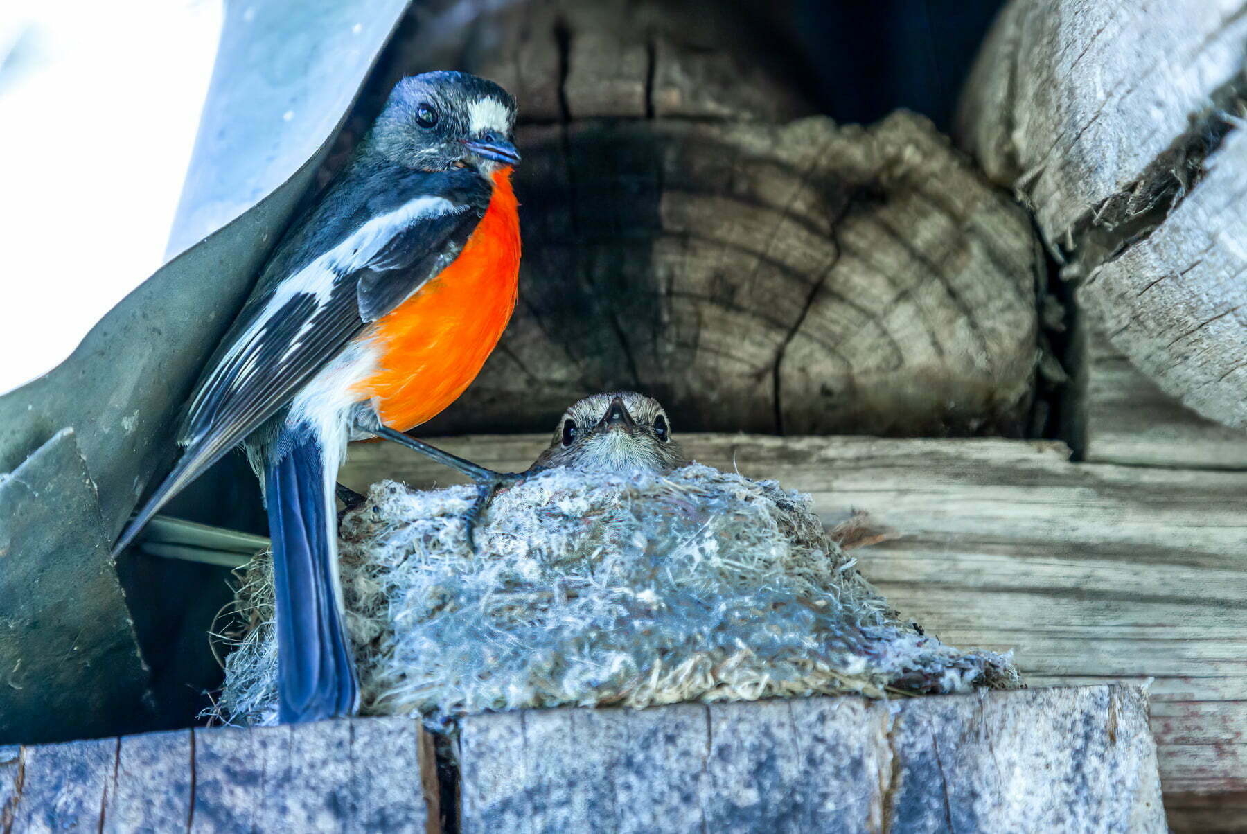 The next morning Steve harassed the local birdlife but managed to get some great shots of the male Scarlet robin (Petroica boodang) feeding its chick in a nest under the roof of Wheelers Hut.