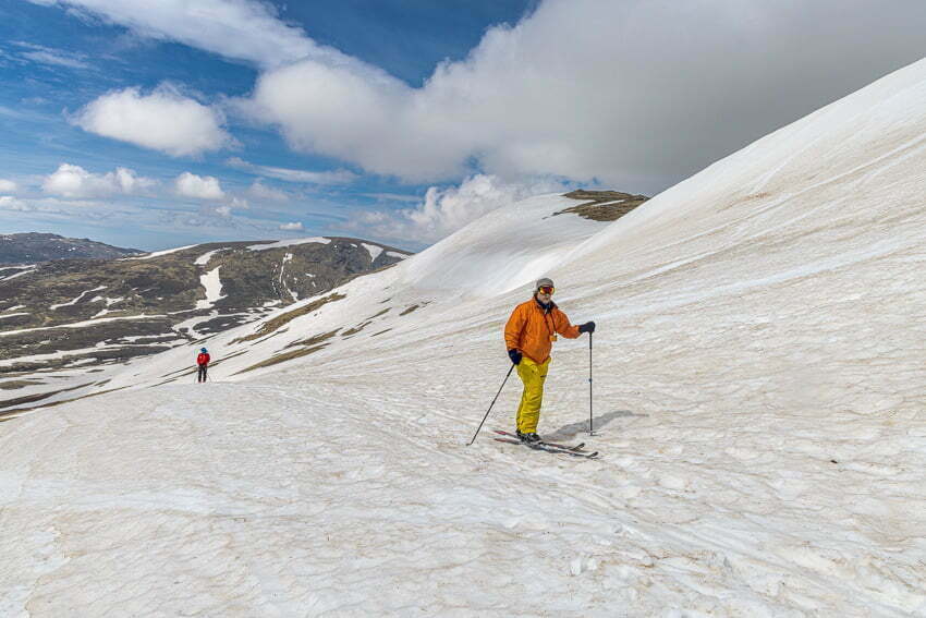 Following a little break, snack and water refill on a grassy patch we crossed over Club Lake Creek and climbed 300m to the top of Carruthers Peak. With awesome views under a clear blue sky, we lingered for a little while before enjoying our descent. By this time we had gone our own ways. I decided to venture up to the Club Lake bowl and try for a few photos, getting about 40m up behind it without skins to gain a slightly different perspective. Damien made an entry from Carruthers whilst I was there, although he snuck his run in before I noticed, I only caught him on a slow glide down Club Lake Creek.