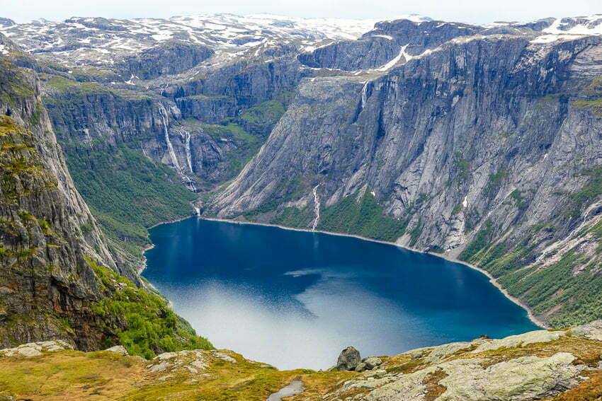 Ringedalsvatnet with surrounding waterfalls